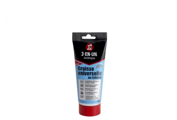 La graisse universelle au Lithium 3-EN-UN Technique assure une lubrification longue durée de tous les mécanismes sujet à un graissage, qu’ils roulent, tournent, glissent ou s’emboitent. Forte de son excellente tenue à la pression et à l’usure et de sa résistance à l’eau, elle réduit les coefficients de frottement tout en protégrant de la rouille et de la corrosion. D’origine minérale, épaissie au Lithium, la Graisse universelle 3-EN-UN Technique adhère parfaitement au support. Elle est indiquée pour tous types de roulements, moyeux, paliers, galets, engrenages, charnières de portail… etc et est adaptée aux conditions extérieures.