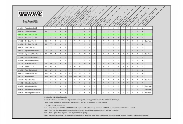 La troisième génération du Pro Chain Tool combine le design efficace et ergonomique du Shop Chain Tool avec les innovations de l’outil phare de Pedro’s, le Tutto Multi Chain Tool. Parmi les caractéristiques, citons le guide d’axe rétractable breveté (RPG) pour une fonctionnalité et une fiabilité supérieures, une mèche et un support pour l’installation des chaînes Campagnolo® 11, 12 et 13 vitesses, et une fente de cisaillement de l’axe de guidage intégrée pour retirer rapidement les sections de guide des axes d’installation. Le pont remplaçable et réglable assure la compatibilité avec toutes les chaînes actuelles et futures.