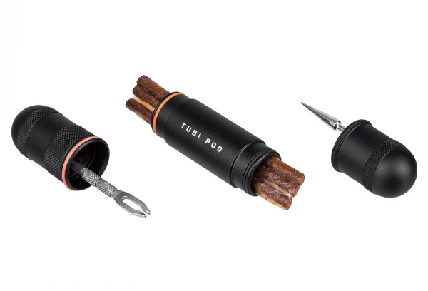 Tubi Pod est un kit de de réparation de pneu tubeless minimaliste. Il se range à l’intérieur d’un boîtier en alliage usiné. Les outils de réparation sont intégrés dans les embouts du boîtier.