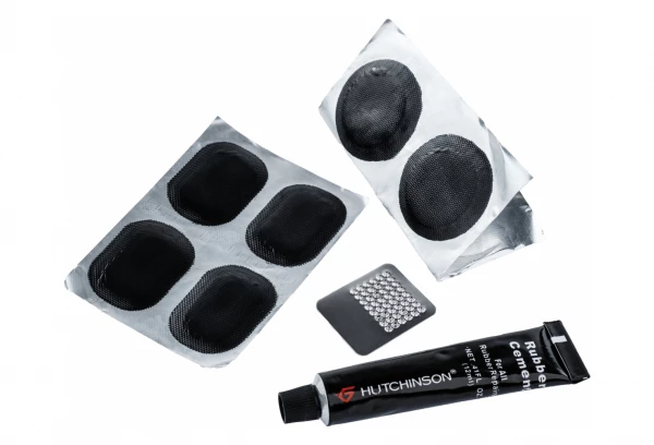 Kit de rustines dédié à la réparation de vos pneus »tubetype » composé de patchs et d’un tube de colle.